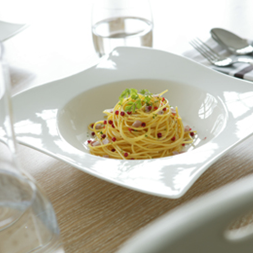 Die originelle Form des Pasta-Tellers der Kollektion NewWave (28 cm) lässt feine Nudelkreationen besonders gut aussehen. Gefertigt aus Premium Porcelain mit Kantenschlagfestigkeit und natürlich mikrowellensicher, spülmaschinenfest, ofenfest und salamanderfest.